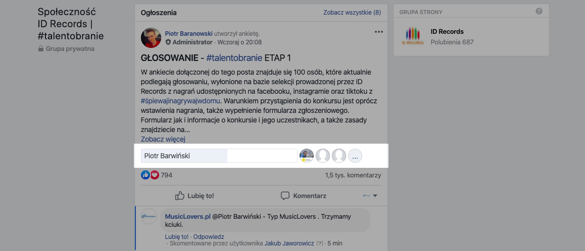 Konkurs jest podzielony na etapy, a więc koniecznie zaglądaj na grupę (lub włącz powiadomienia) i głosuj w kolejnych etapach, aby dać szansę uczestnikowi na wygraną.