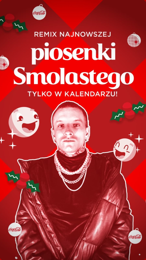 Coca Cola wystartowała z kalendarzem świątecznym, gdzie codziennie znajdują się nagrody, filtry lub upominki, np. zniżki na zakupy, darmowa dostawa z Glovo i… filmy oraz piosenki w tym premiera wyjątkowego Remixu przygotowanego specjalnie dla Coca Coli przez Smolastego.